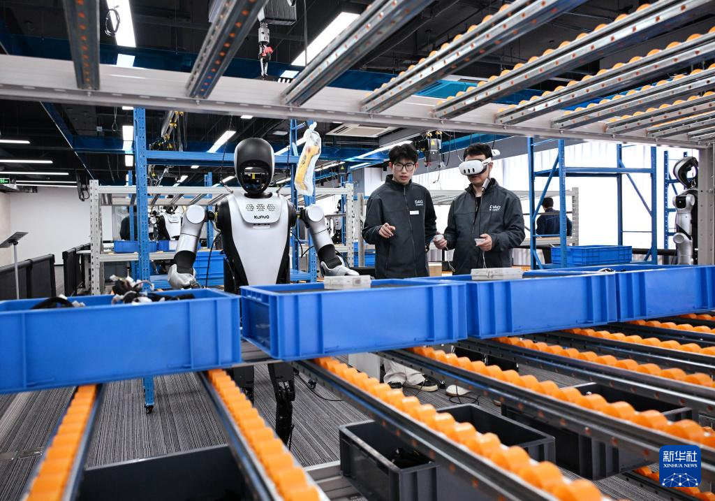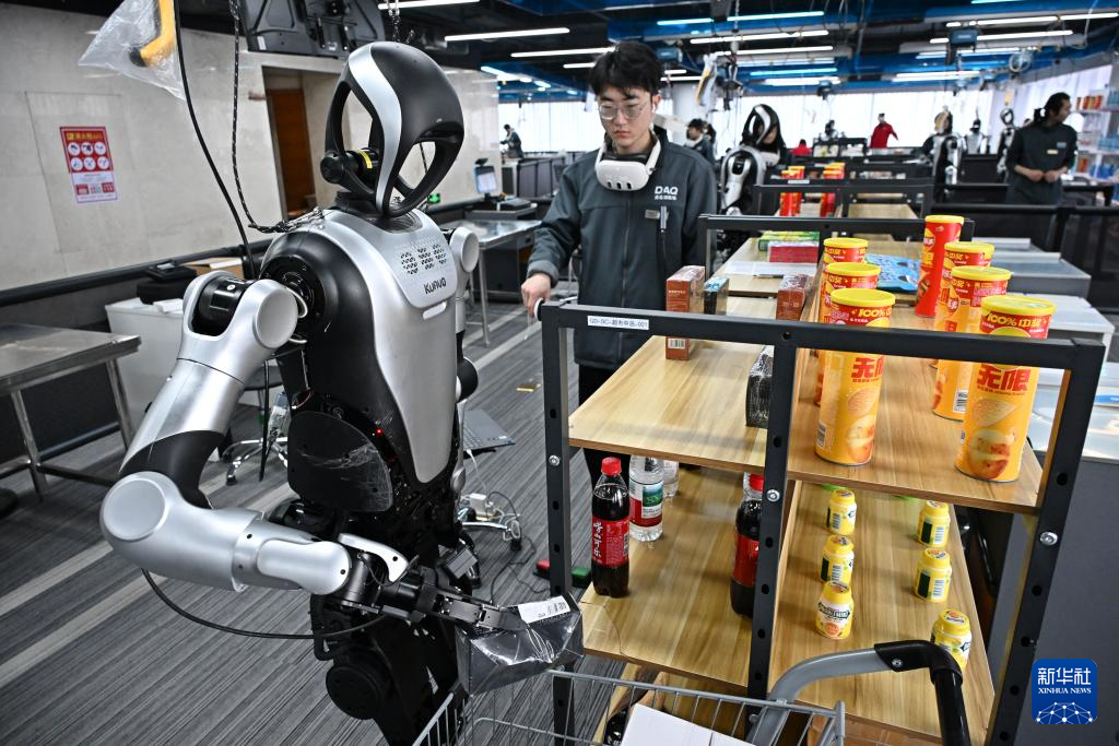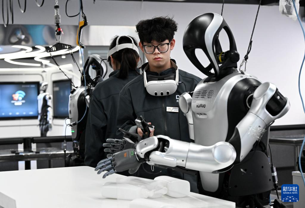 3月23日,在青岛市人形机器人数据采集训练场,工作人员对人形机器人进行训练和数据采集。