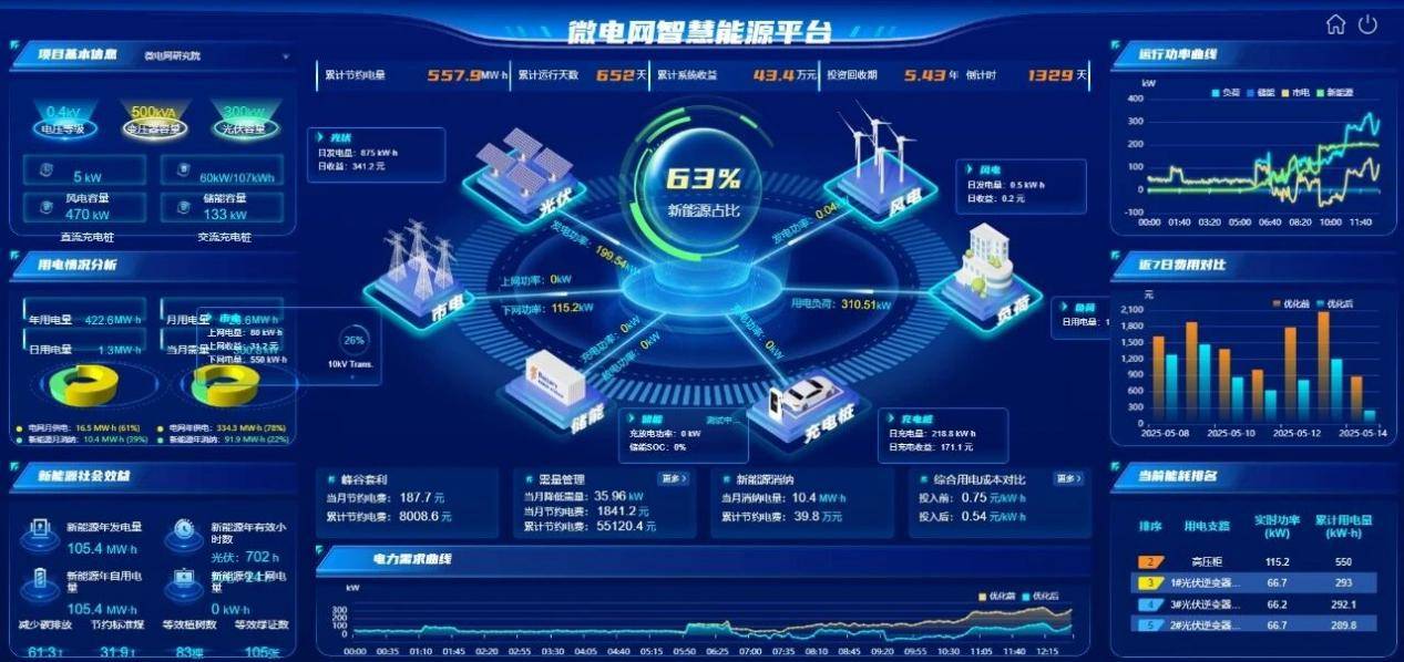 汇聚源-网-荷-储-充全环节运行数据,实现毫秒级存储展示、实时状态监测与智能运行告警。系统以可视化仪表盘直观呈现微电网电量、碳排放、用能成本及核心设备运行状态,动态描绘电力潮流流向与设备安全态势,让每一度电的来龙去脉尽收眼底,助力园区管理者整体掌控微电网运行全局。